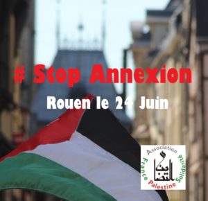 Le cortège était constitué de 8 hommes/femmes portant des panneaux reprenant le matériel de la campagne nationale de l’AFPS et invitant à participer aux actions proposées. D’autres portaient un gilet orange avec une cartouche « Stop Annexion » et distribuaient et des flyers à ceux qui le souhaitaient.