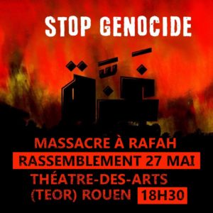 Pour réclamer la fin du carnage à Rafah et dans toute la bande de Gaza, pour exiger que la France réagisse vite, en solidarité avec les Palestiniennes et les Palestiniens, nous appelons à un rassemblement ce soir à la station Teor du Théâtre des Arts de Rouen à partir de 18h30.